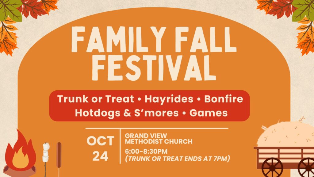 Join us at Grand View Methodist Church on Thursday, October 24 from 6:00–8:30 PM for a night of fall fun! Bring the whole family for Trunk or Treat (ends at 7 PM), hayrides, a cozy bonfire, hotdogs, s’mores, and games. It’s the perfect way to celebrate the season together—don’t miss it! Add Event to your […]
